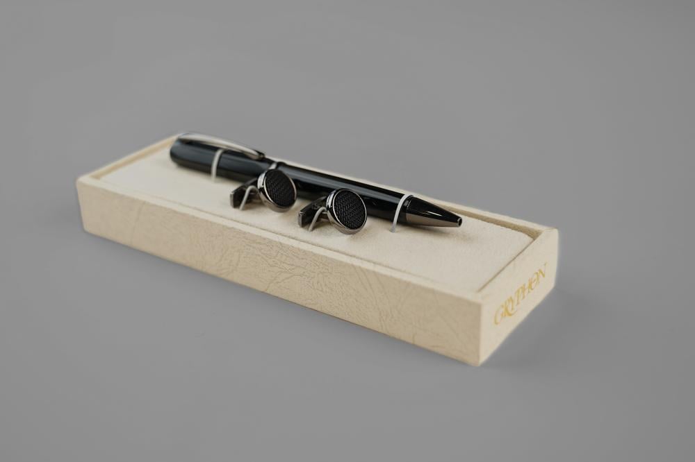 طقم قلم وكبك من جرايفون باللون الأسود اللامع، مزين بتفاصيل رمادية أنيقة تضفي لمسة من الفخامة والتميز.