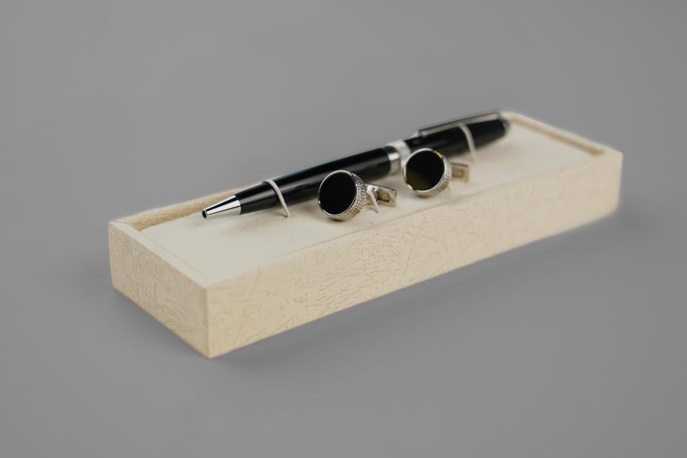 طقم قلم وكبك من جرايفون باللون الأسود اللامع، مزين بتفاصيل فضية أنيقة تضفي لمسة من الفخامة والتميز. يجمع هذا الطقم بين التصميم العصري والأناقة الكلاسيكية، مما يجعله الاختيار المثالي لإضفاء لمسات من التميز على إطلالتك. سواء كان للاستخدام الشخصي أو كهدية راقية، فإن هذا الطقم سيعكس ذوقك الرفيع في كل مرة تستخدمه.